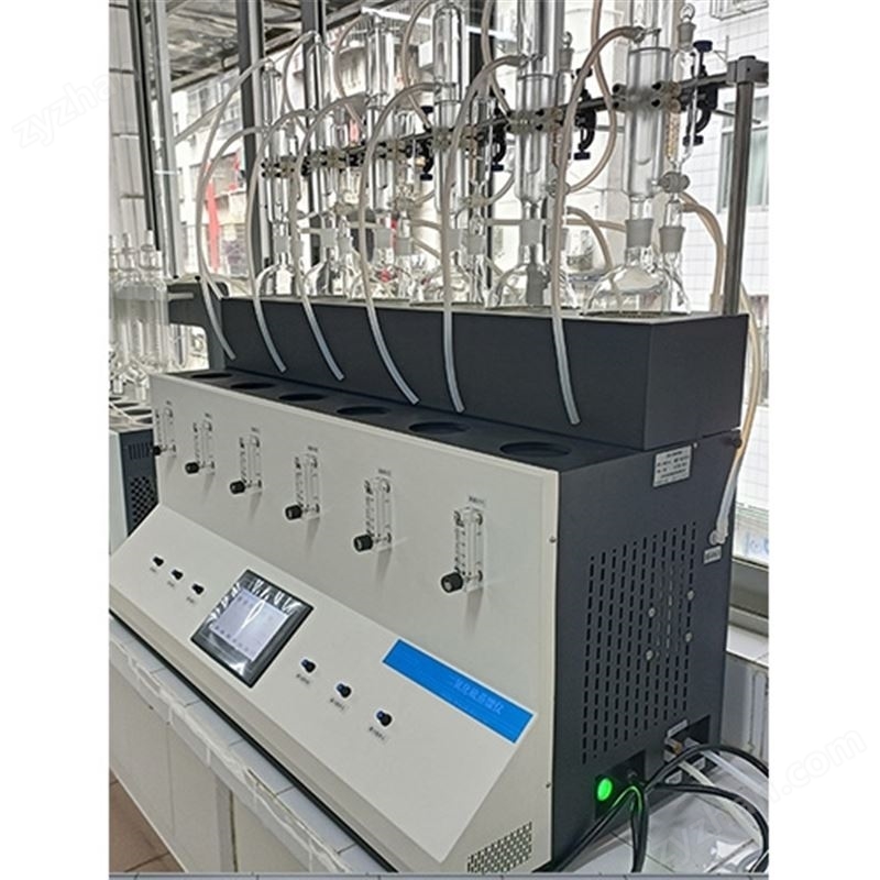 主要原理是根據藥典中所提供的檢測方法,將中藥材以蒸餾法進行處理,樣品中的亞硫酸鹽系列物質加酸處理后轉化為二氧化硫后,隨氮氣流帶入到含有雙氧水的吸收瓶中,雙氧水將其氧化為硫酸根離子,采用酸堿滴定法測定,計算藥材及飲片中的二氧化硫殘留量。本產品在嚴格遵循藥典要求的基礎上,整合加熱,蒸餾,水循環及氮吹等功能為一體,可同時提供3-6個樣品(空白樣,平行樣)的處理,從而極大的提高了檢測數據的精度和減少了工作時間。