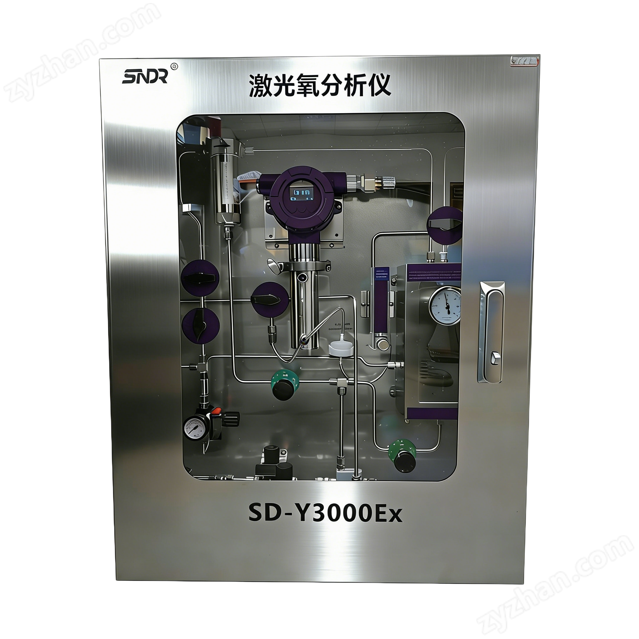 SD-Y3000 EX 激光氧分析儀,為連續監測精細化工/石油化工/生物制藥/鋼鐵冶煉/焦 爐煤氣/新型能源等管道氣體含量設計的在線分析儀器,分析儀采用TDLAS技術(可調諧半導體激光光譜吸收技術Tunable Diode Laser Absorption Spectroscopy),為目前氣體測量方法之一,該儀表具有靈敏度高、響應速度快、不受背景氣體干擾、非接觸式測量等特點,為實時準確地反映各種氣體變化提供了可靠參考數據。根據工藝點不 同,可選擇不同測量參數,監測系統能準確測量樣氣中的氣體含量。該過程分析裝置已成 功應用于國內多家生產企業以及設備生產廠家,為企業獲得了良好的經濟效益和社會效 益,贏得了用戶及生產廠商的好評。 整套裝置包括采樣、預處理、分析三部分組成,預處理部分采用分級過濾除塵、除雜質、渦旋冷凝器降溫除水,以此來保證分析部分的壽命和測量精度,并將檢測到的氣體含量以4-20mA的電流信號提供給用戶,用于實現系統工藝自動控制。