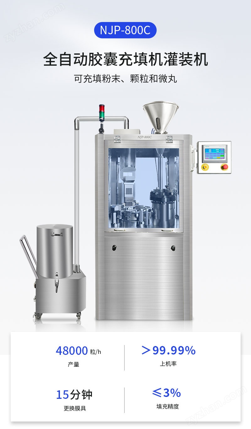 NJP-800C膠囊充填機可以將粉狀、顆粒等物料充填至空膠囊(000#、00#、0#、1#、2#、3#、4#、5#)。
